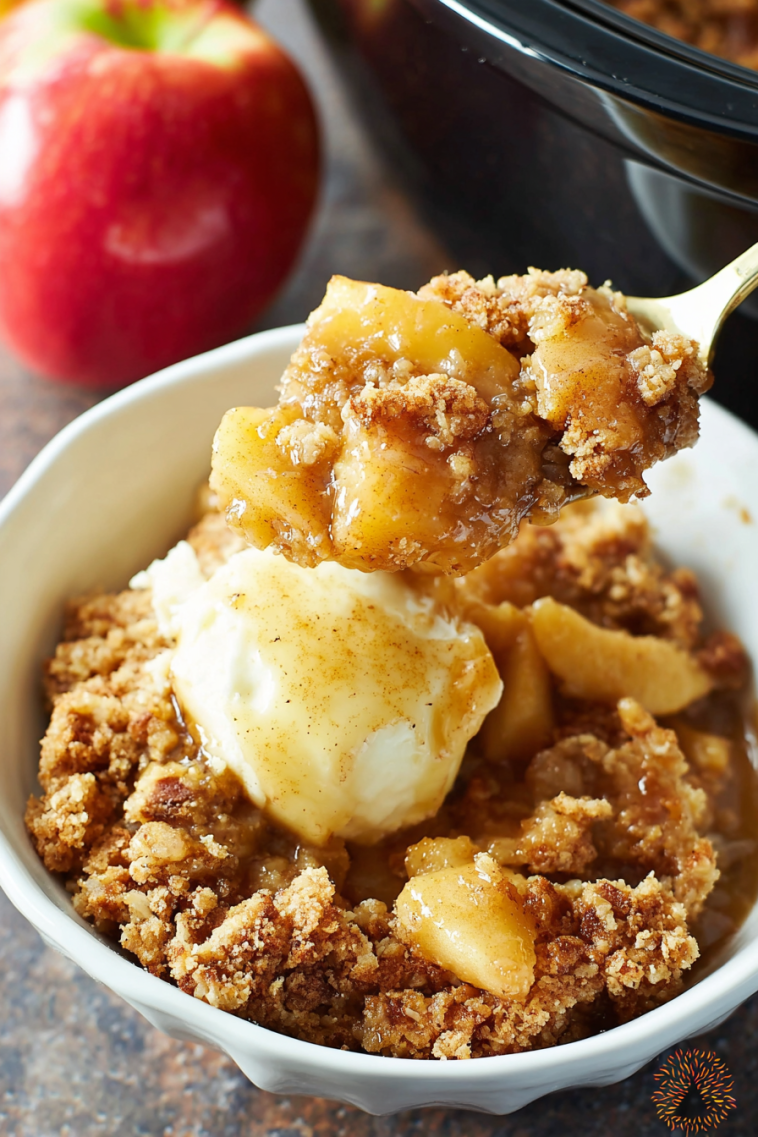 High for about 2–2½ hours. Low for 4–5 hours. You’ll know it’s ready when the top looks kinda cakey and the edges are golden and the apples are bubbling. It’s okay if it’s a little saucy underneath—this ain’t a dry cake situation. -